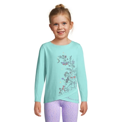 Our Little Girls Raglan Graphic Tee is designed for playtime and for parents who know how wild playtime can often be. The shoulders are durable and reinforced because who knows what kind of wear and tear kids’ shirts take when they’re running jumping cartwheeling and monkey bar dangling. 100% cotton and easy to wash. In fact it’s passed a 20 wash test so you know it won’t shrink in the laundry. That day 1 cozy softness will last no matter how many grass stains spills and mud your little girl comes up against.The patterns on these raglan baseball shirts are eye-popping and exciting calling on the adventurous spirit of your little one. The heat transfer back neck label is a no-fuss design for exactly that reason: no fussing about an itchy tag. Making your little girls’ shirts as comfortable as possible so that they can be as long lasting as possible is what makes this shirt the kind of quality that Lands’ End loves to offer.