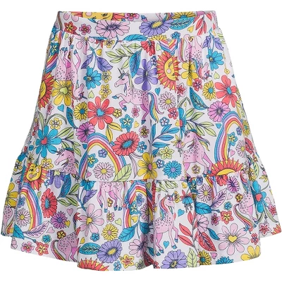 At Lands’ End we believe comfortable kids are happy kids. That’s why we select breathable stretchy fabric when designing our kids’ clothing. Our Little Girls Twirl Knit Skort is no exception. Made from breathable 100% cotton knit with just-enough-stretch and a comfy elastic waist these girls skorts are designed with her active lifestyle in mind. Whether she’s busy running jumping climbing or falling we’ve got her covered. The mid-thigh 2.75 inseam shorts underneath fit snug on her leg and won’t ride up when she’s playing and will keep her modestly covered when she shows off on the playground doing cartwheels or playing on the monkey bars. And the cute gathered bottom ruffle tier offers a dressier option than leggings joggers or jeans when you need her to dress up but want her to be comfortable. Perfect outfit choice for the first day of school picture day a special day out with mom or dad or even just playing in the backyard. Available in fun novelty prints like hearts tie dye rainbow polka dot plus solid black and navy there’s sure to be a girls twirl knit skort fit for your little lady’s unique style. Plus the classic navy and black options can provide comfy alternatives to traditional school uniform skirts. Offered in Little Kid Plus Size and Big Girl sizes. Lands’ End sizing is as follows: Toddler 2T-4T Little Kid 4-7 6x Big Girl 7-16 Big Boys 8-20; Consult sizing chart for their true size fit.