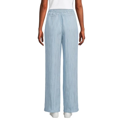 - Wide leg style is fitted at the waist and hips, looser through thighs and gently flares all the way down the leg