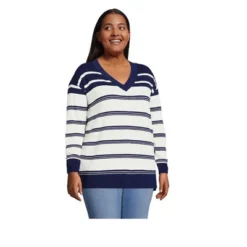 Lands’ End Women’s Fine Gauge Cotton V-Neck Pullover Tunic Sweater – Stripe